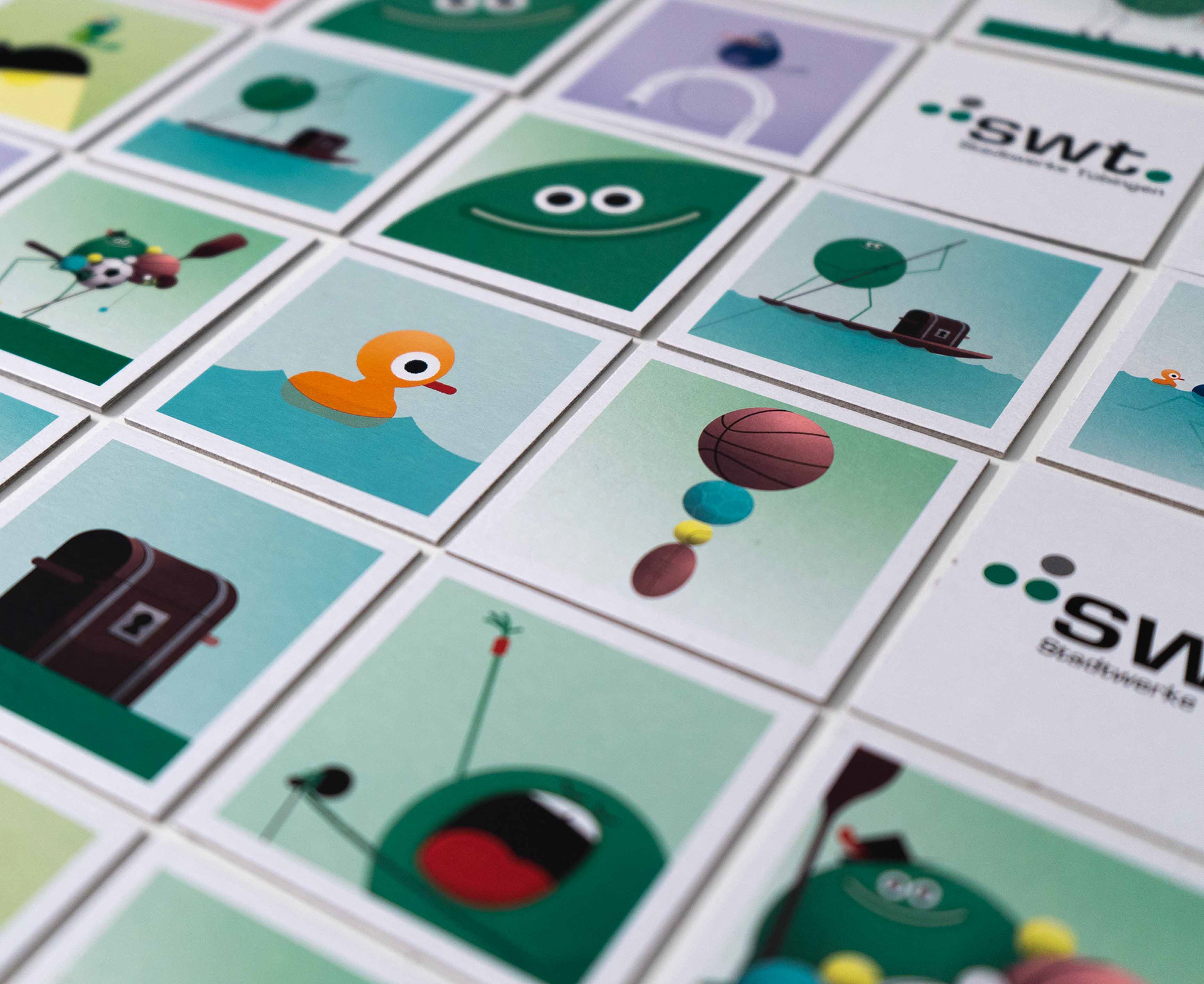 The campaign consists of billboards and print products which can be distributed at fairs, exhibitions or online giveaways as well as short animated videos for social media and perimeter advertising. The pictures below show a selection of the print products (a memory game, a shopping chip, coasters and postcards) and the advertising boards which are spread in the whole region.